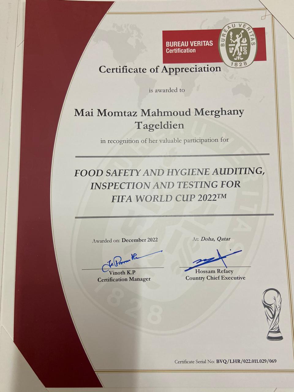 تم قبول مي في المشاركة بمونديال 2022، ضمن فريق المفتشين المسئولين عن سلامة الغذاء، وهو يضم نحو 10 جنسيات من مختلف دول العالم، إلا أن مي تمكنت من تمثيل اسم مصر، خلال مشاركتها.