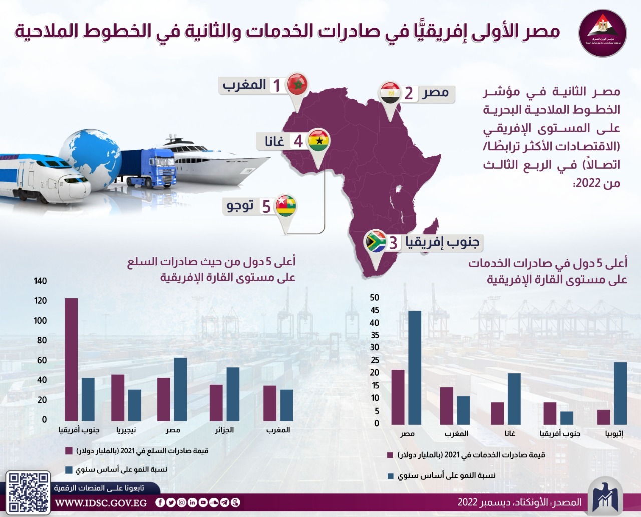 كما حققت مصر معدل نمو كبير في صادراتها للخدمات خلال 2021 بمعدل 45.5% على أساس سنوي. ومن الجدير بالذكر، أن مصر تحقق مركزًا مرتفعًا في مؤشر الخطوط الملاحية البحرية على المستوى الإفريقي (الاقتصادات الأكثر ترابطًا/ اتصالًا)؛ حيث جاءت في المرتبة الثانية بعد المغرب في الربع الثالث من 2022، هذا بالإضافة إلى احتلالها المرتبة الثالثة من حيث الصادرات السلعية إفريقيًّا في 2021.