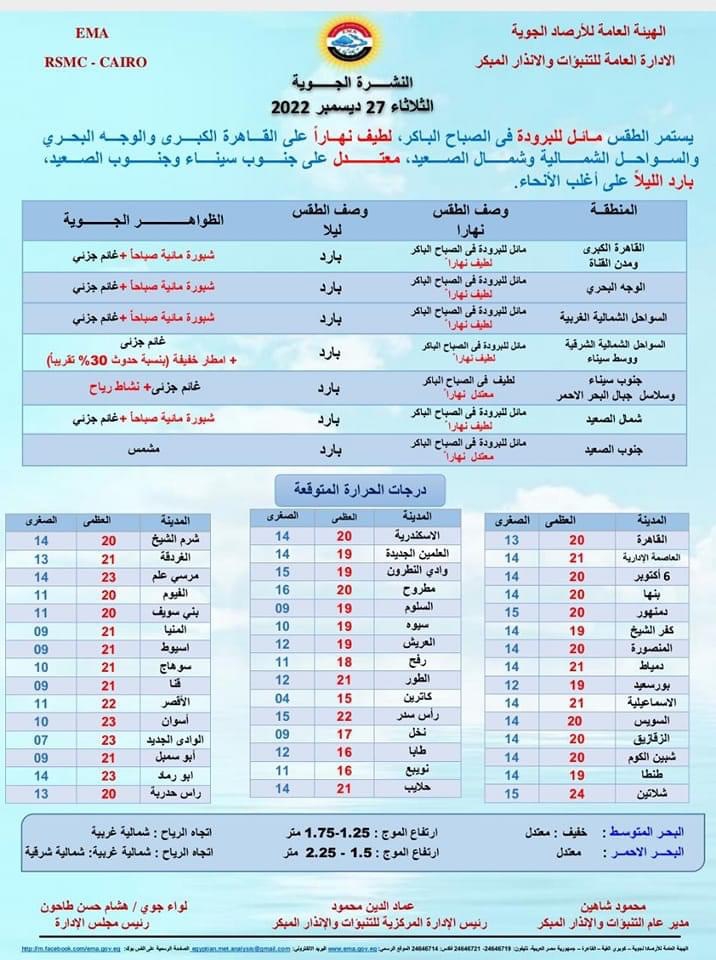 بارد ليلًا والصغرى 13.. موجز حالة الطقس اليوم الثلاثاء 27 ديسمبر 2022