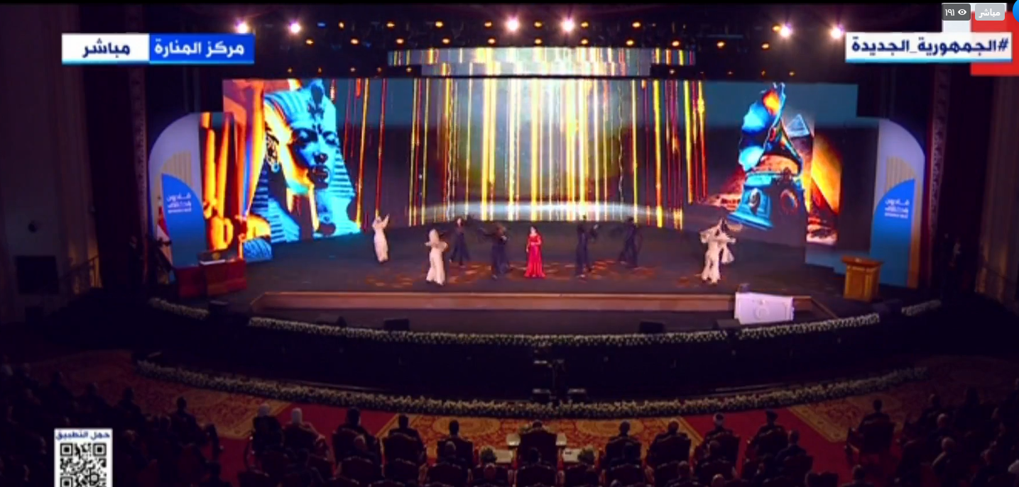 واستعان القائمون على الحفل بمقطع من أغنية أنت عمري، لكوكب الشرق أم كلثوم، بجانب أغنية مصر التي في خاطري؛ لتمتليء القاعة بالتصفيق الشديد، والتفاعل الكبير فور الاستعانة بأغاني كوكب الشرق.