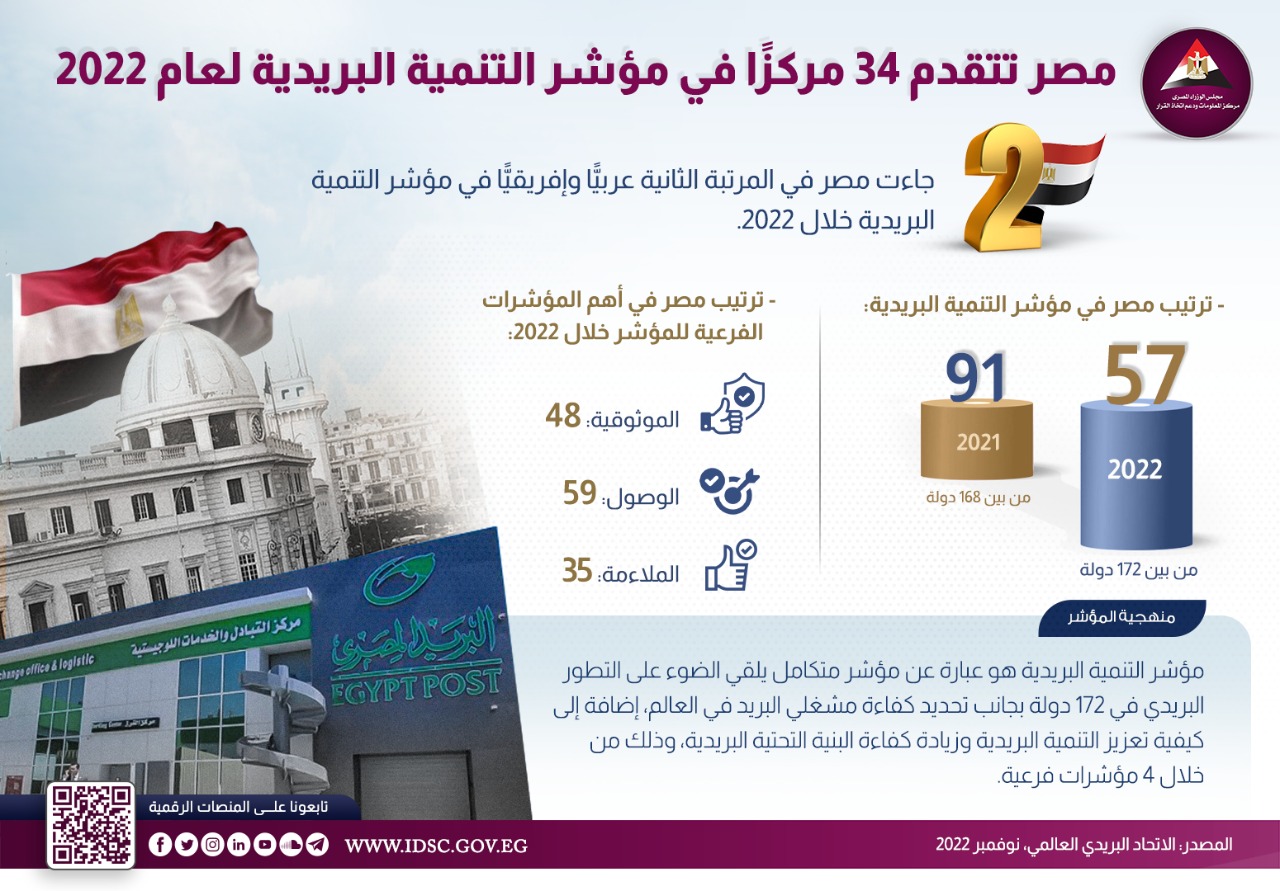 نشر مركز المعلومات ودعم اتخاذ القرار، انفوجراف يتناول مصر بمؤشر التنمية البريدية لعام 2022، وقد قفزت مصر 34 مركزًا فى المؤشر خلال 2022، لتأتي بذلك في المرتبة الـ 57 من بين 172 دولة، مقارنة بالمرتبة الـ 91 من بين 168 دولة في 2021.