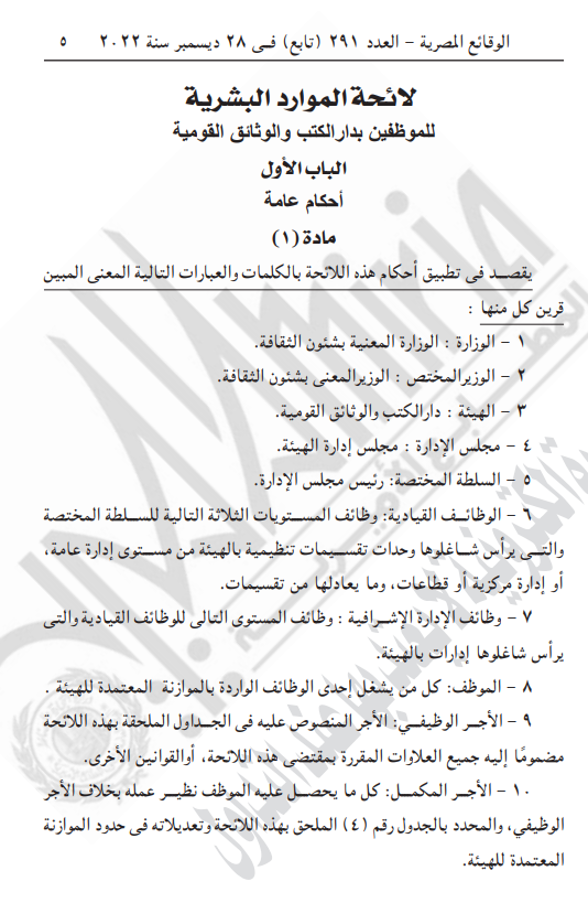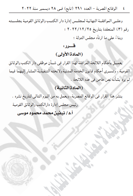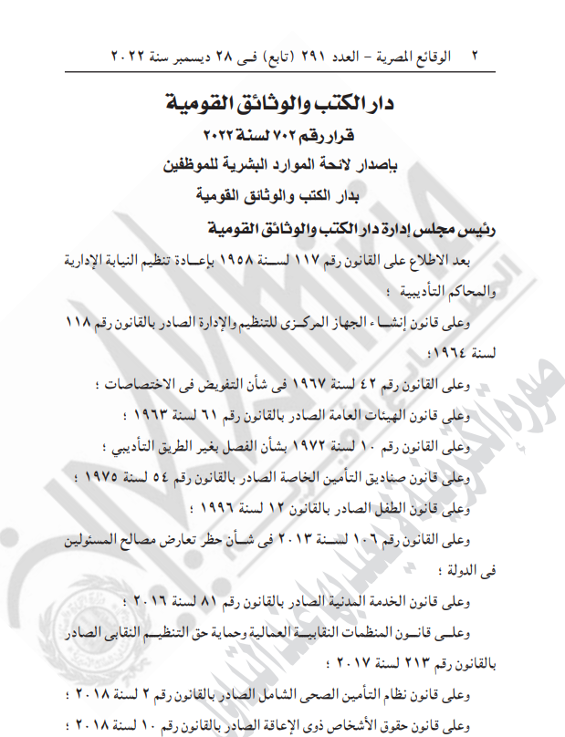 نشرت جريدة الوقائع الرسمية، القرار الجمهوري الخاص بلائحة الموراد البشرية لموظفي دار الكتب والوثائق القومية.