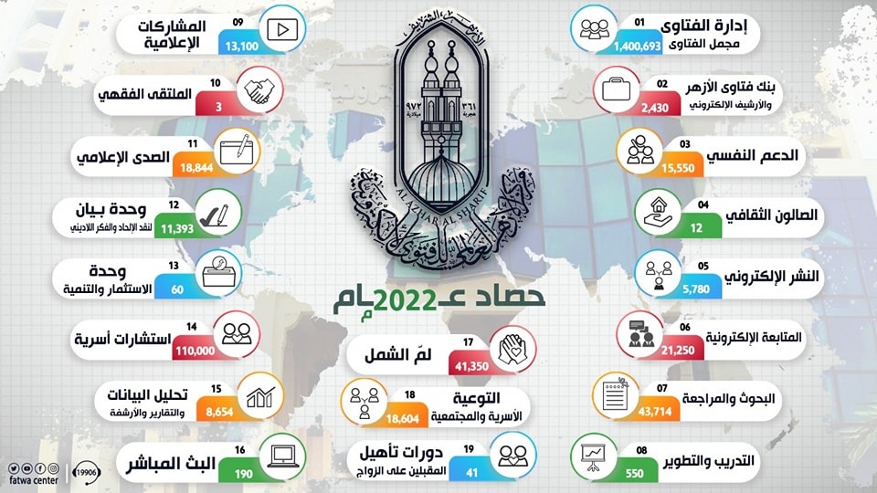 وكتب الأزهر للفتوى عبر حسابه على موقع التواصل الاجتماعي فيس بوك: حصاد مركز الأزهر العالمي للفتوى الإلكترونية لعام 2022، عمل جاد وجهد متواصل لمركز الأزهر العالمي الإلكترونية في العمل الإفتائي والميداني والدعوي والتوعوي والاجتماعي والأسري والتثقيفي والبحثي التأصيلي والإعلامي والتعليمي والتدريبي.