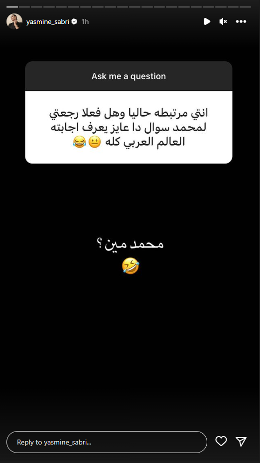 وردت ياسمين صبري على سؤال متابع حول حقيقة ارتباطها، جاء فيه: أنت مرتبطة حاليًا وهل فعلًا رجعتي لمحمد السؤال ده عاوز يعرف إجابته العالم العربي كله، لترد ساخرة: محمد مين؟