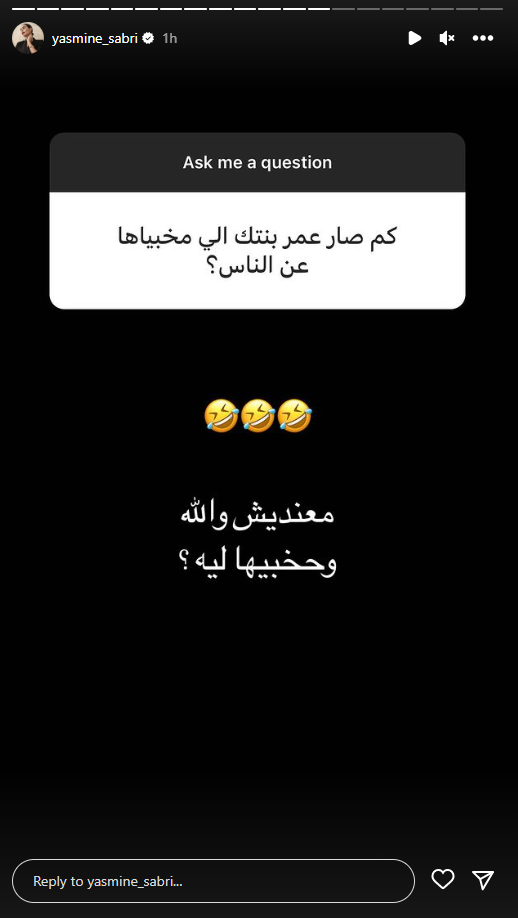 وردت ياسمين صبري على سؤال متابع سألها عن ابنتها قائلة: معنديش والله وهخبيها ليه.