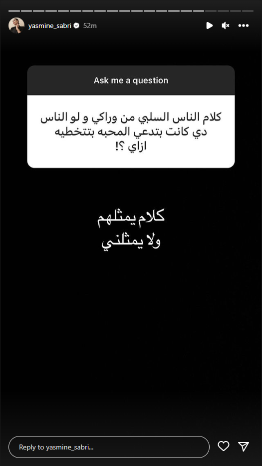وأكدت ياسمين صبري أن الكلام السلبي الذي تتعرض له لا يمثلها ومن يقولونه لا يمثلونها.
