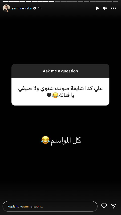 وردت ياسمين صبري على سؤال: شايفة صوتك شتوي ولا صيفي يا فنانة: قائلة: كل المواسم.