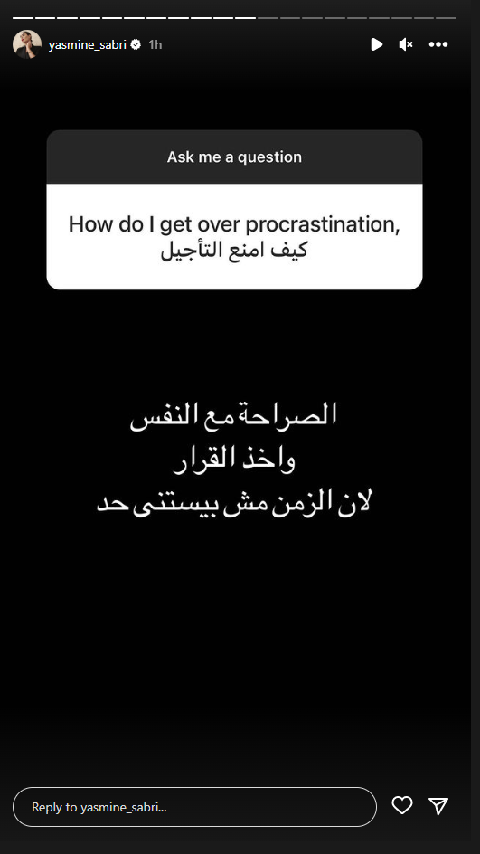 أما عن سؤال متابع لها عن كيف تمنع التأجيل، قالت: الصراحة مع النفس واخذ القرار لأن الزمن مش بيستنى حد.