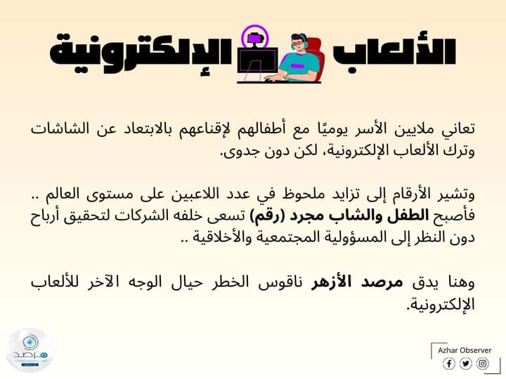 ووفق ما تابعه مرصد الأزهر من مؤشرات وإحصائيات فإن بعض اللاعبين وصلوا إلى مرحلة إدمان الألعاب الإلكترونية، ولهذا اتخذ العديد من الخطوات للتحذير من خطورتها عبر رصد أبعادها اجتماعيًا ونفسيًا وبيان كيفية الحد من آثارها الجانبية على الأطفال والشباب.