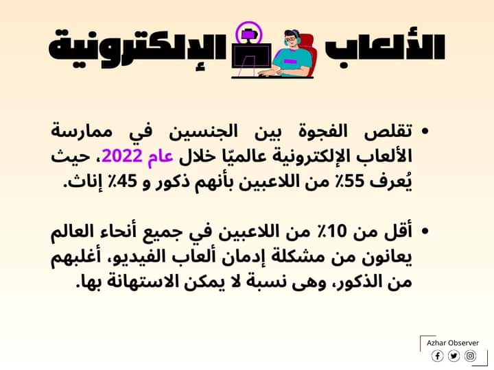 وذكر مرصد الأزهر بعض الإحصائيات الخاصة بممارسة الأطفال للألعاب الإلكترونية، كان أبرزها تقلص الفجوة بين الجنسين في ممارسة الألعاب الإلكترونية عالميًا خلال عام 2022، حيث بلغت نسبة الذكور اللاعبين 55%، فيما بلغت نسبة الإناث 45%.