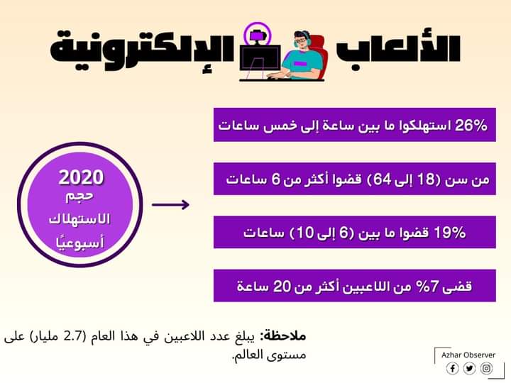 مرصد الأزهر لفت كذلك إلى أن أقل من 10% من اللاعبين يعانون من إدمان الألعاب الإلكترونية وأغلبهم من الذكور، لافتًا إلى أن هذه النسبة لا يمكن الاستهانة بها.