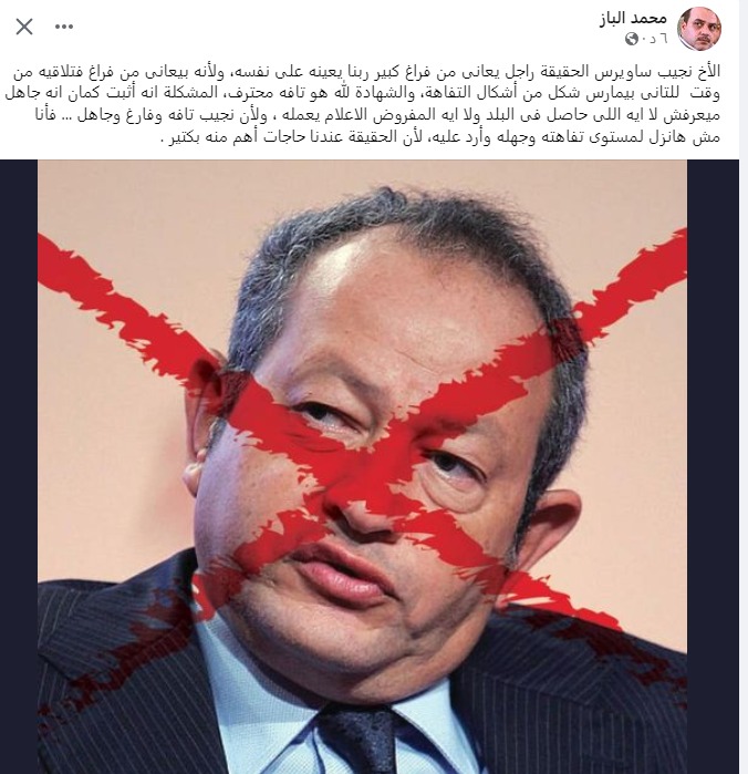 وكتب محمد الباز، منشورًا عبر حسابه الشخصي بموقع فيسبوك، جاء فيه: الأخ نجيب ساويرس الحقيقة راجل يعاني من فراغ كبير، ربنا يعينه على نفسه.