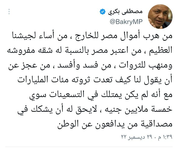 وعلق الكاتب الصحفي مصطفى بكري، عبر حسابه الشخصي بمواقع التواصل الاجتماعي، وكتب منشورًا جاء فيه: من هرب أموال مصر للخارج، من أساء لجيشنا، العظيم، من أعتبر مصر بالنسبة له شقة مفروشة، ومنهب للثروات.