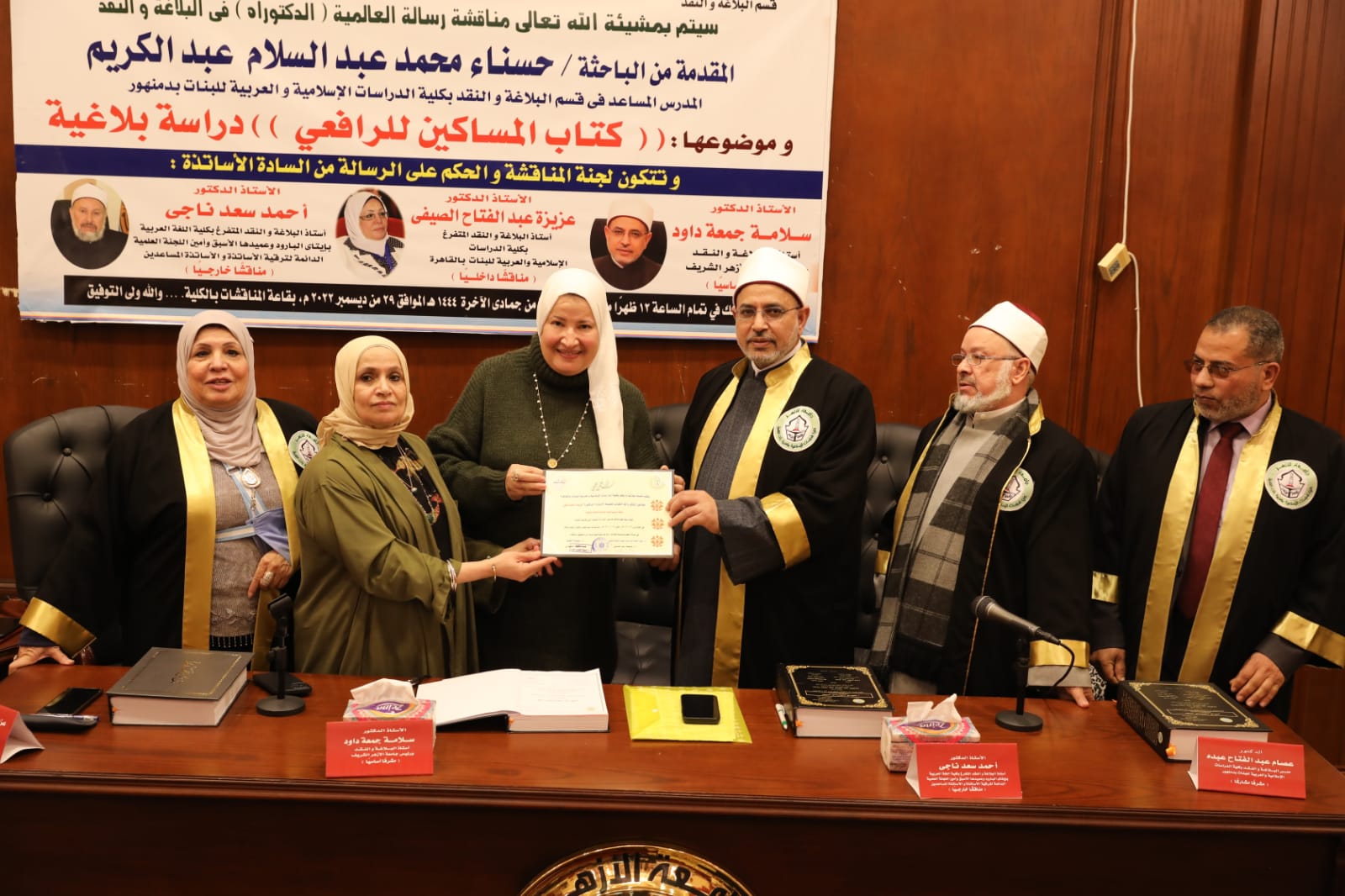 وحضر التكريم الدكتورة فاطمة رجب، وكيلة الكلية للدراسات العليا والبحوث، والدكتورة وفاء غنيمي، وكيلة الكلية لشئون التعليم والطلاب، والدكتورة فريدة محمد علي حسن، رئيس قسم البلاغة والنقد بالكلية.