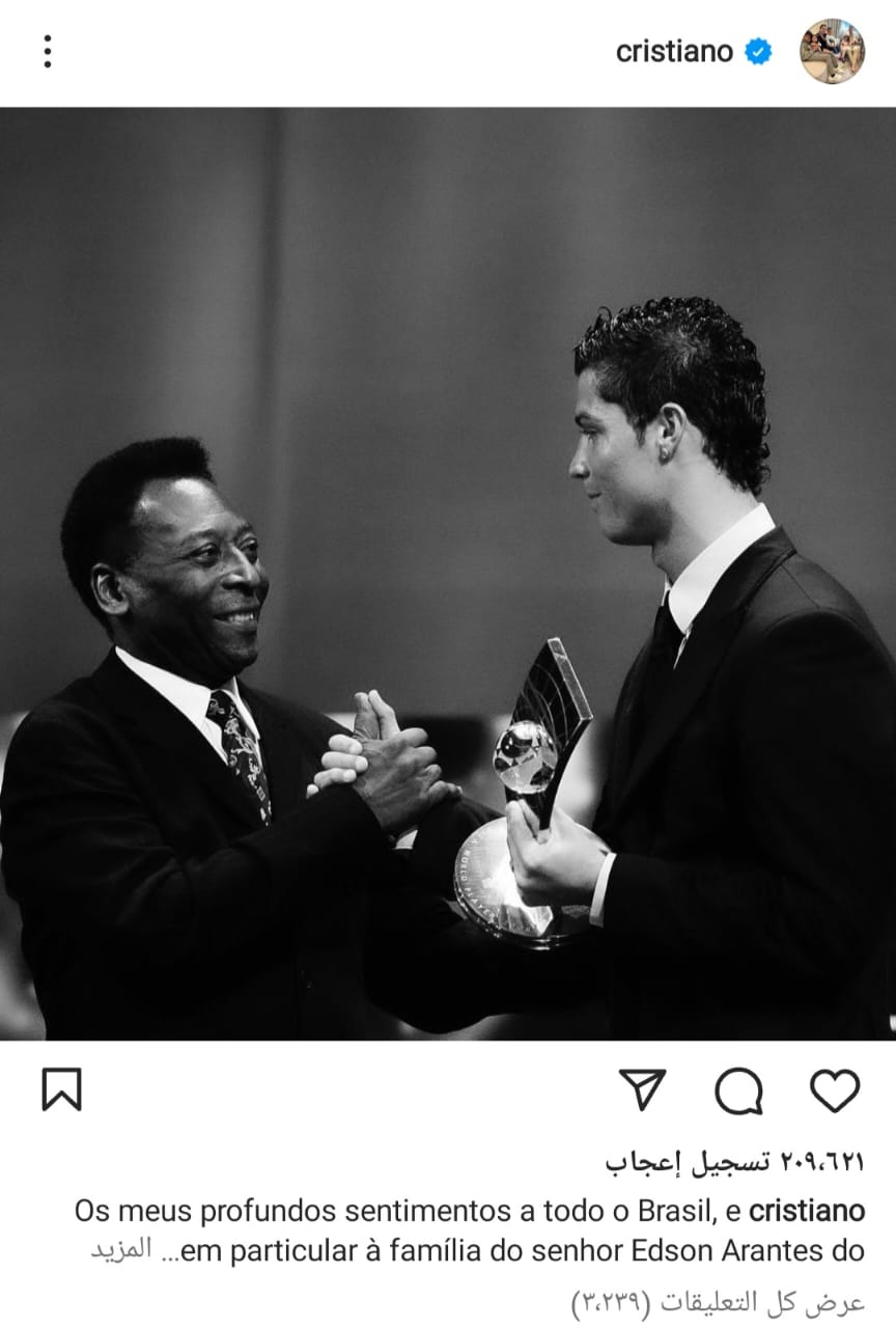 وكتب رونالدو عبر حسابه الشخصي على موقع التواصل الاجتماعي فيسبوك نعيًا لـ بيليه: التعازي الحارة لكل البرازيل، بيليه كان مصدر إلهام للعديد من الملايين، الحب الذي أظهرته لي دائمًا كان متبادلًا في كل لحظة نتشاركها حتى من بعيد، لن ننسى أبدًا وستعيش ذكراه إلى الأبد في كل واحد منا عشاق كرة القدم.. ارقد في سلام الملك بيليه.
