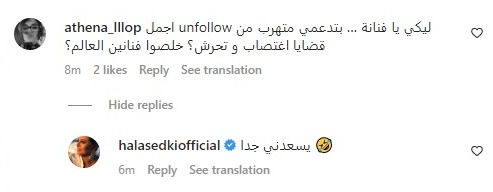 كما جاء تعليق من متابع آخر مستنكرًا دعم هالة صدقي لسعد لمجرد المتهم في عدة قضايا اغتصاب وتحرش، قائلًا: بتدعمي متهرب من قضايا اغتصاب وتحرش؟ خلصوا فنانين العالم؟ أجمل أنفولو ليكي يا فنانة، وجاء ردها: يسعدني جدًا.
