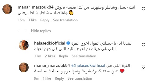 وتابع متابعو هالة صدقي نشر تعليقاتهم المنتقدة لمنشور هالة صدقي، حيث سخرت إحدى متابعيها من دعمها لسعد لمجرد، وقالت: أنت جميل وشاطر ومتهرب من كذا قضية تحرش واغتصاب، شاطر شاطر يعني، وعقبت هالة على هذا التعليق: عندنا آية يا جميلتي بتقول أخرج القزة اللي في عينك ثم أخرج القزة التي في عين أخيك، وجاء تعليق آخر مضمونه: لو كانت بنتك من اللي اتحرش بيهم كان هيكون ليكي رأي تاني.