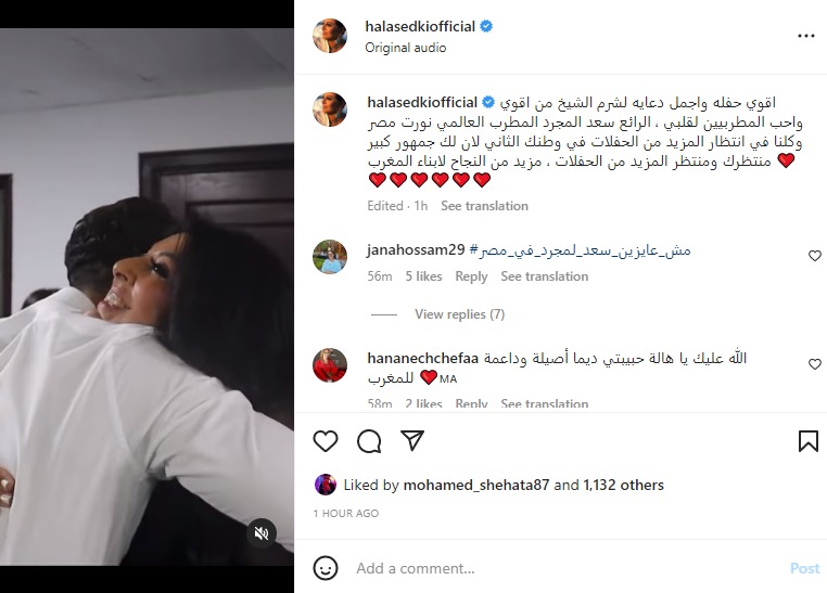 من جانبها، نشرت هالة صدقي فيديو قصير يجمعها وأولادها بسعد لمجرد في كواليس حفله بمدينة شرم الشيخ، عبر حسابها الرسمي على موقع إنستجرام، وعلقت عليه قائلةً: أقوى حفلة وأجمل دعاية لشرم الشيخ من أقوى وأحب المطربين لقلبي، الرائع سعد لمجرد المطرب العالمي، نورت مصر وكلنا في انتظار المزيد من الحفلات في وطنك الثاني لأن لك جمهور كبير منتظرك ومنتظر المزيد من الحفلات، مزيد من النجاح لأبناء المغرب.