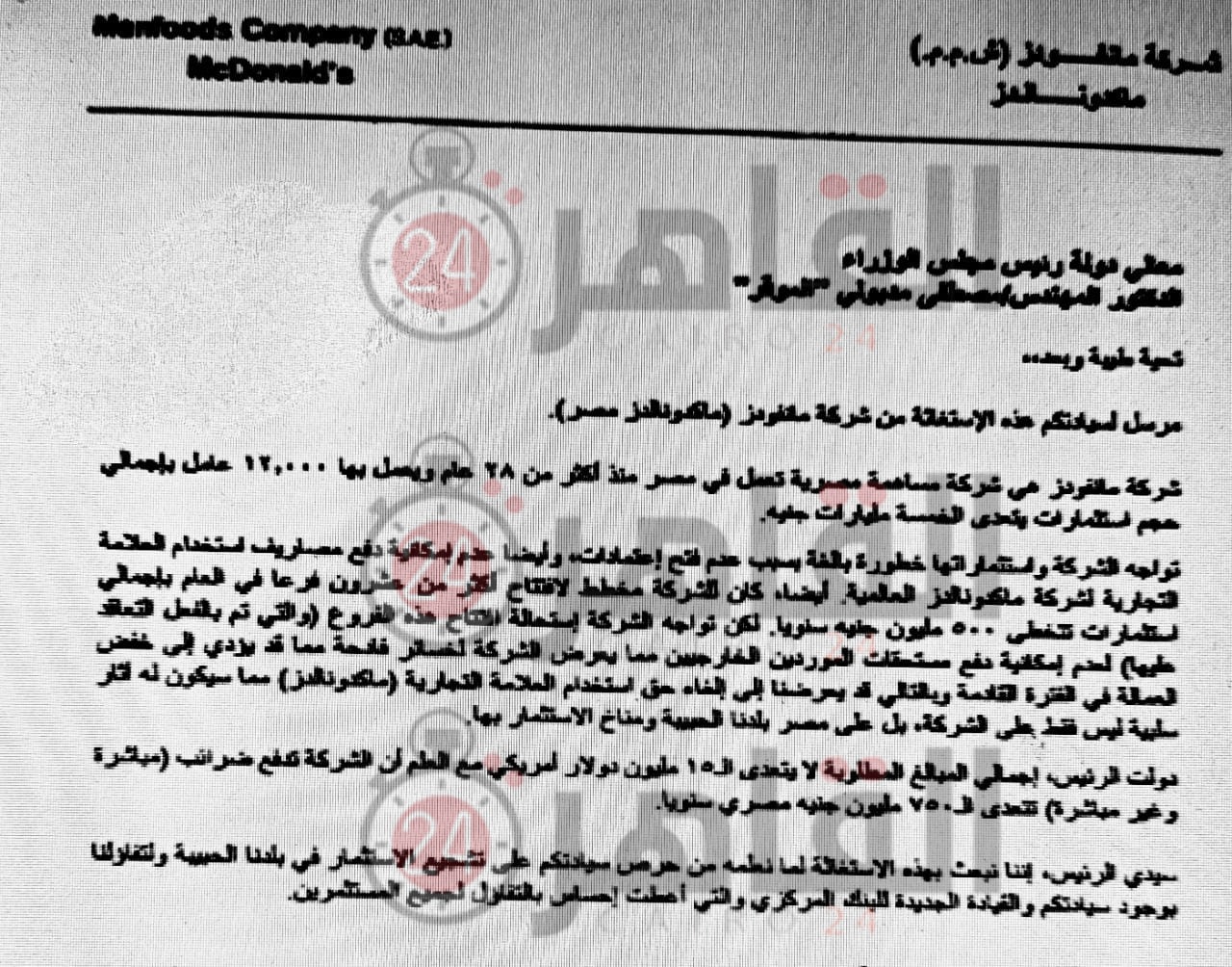 ورغم نفي الشركة ينشر موقع القاهرة 24 نص المذكرة التي أرسلتها الشركة للدكتور مصطفى مدبولي، رئيس مجلس الوزراء، أكدت فيها أن استثماراتها تواجه خطورة بالغة بسبب عدم فتح اعتمادات وأيضًا عدم إمكانية دفع مصاريف استخدام العلامة التجارية لشركة ماكدونالدز العالمية.