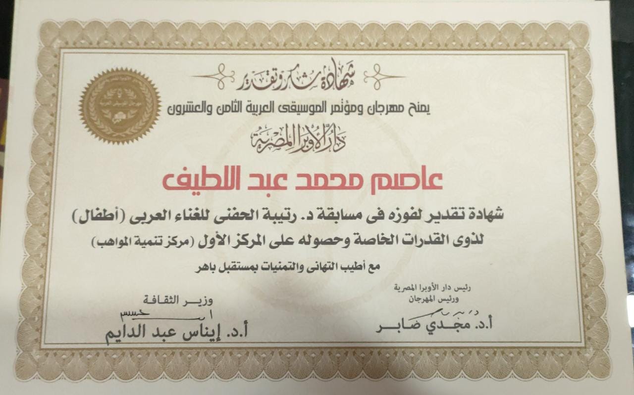 عاصم عبد اللطيف، الطالب في الصف الثالث الإعدادي، متحدي التوحد، منحه الله هبتين وهما الصوت العذب والقدرة الجيدة على الحفظ وقد أحسن استغلالهما، تسانده والدته بشكل مستمر وهي مصدر الدعم له دائمًا.