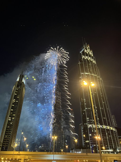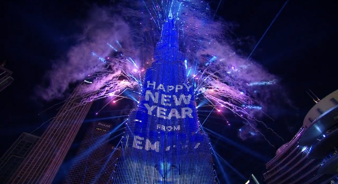 وشهدت احتفالات برج خليفة للعام الجديدة تسجيل رقم قياسي جديد بموسوعة جينيس للأرقام القياسية بإطلاقه أضخم عرض للألعاب النارية وعرض لطائرات الدرونز والليزر لمدة 60 دقيقة متواصلة، حسب ما أشار تليفزيون دبي.