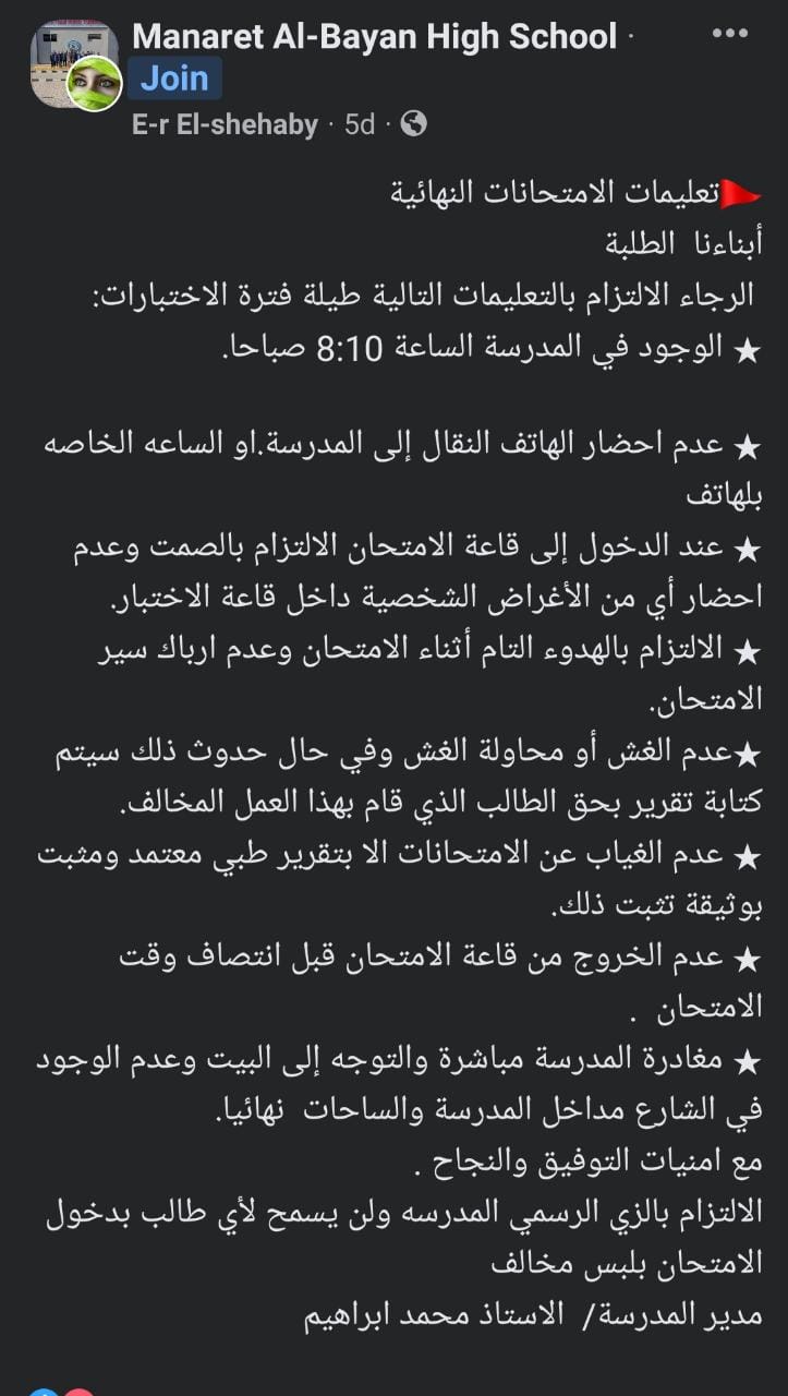 وأعلنت المدارس عبر صفحتها الرسمية على موقع التواصل الاجتماعي فيسبوك، تعليمات للطلاب، والتي شملت الآتي: