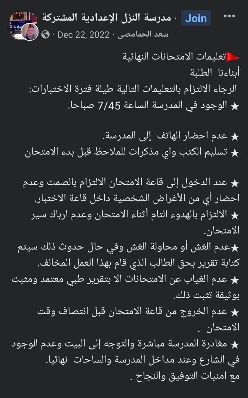 في وقت سابق، وجّهت المديريات التعليمية؛ تعليمات لمديري المدارس، بشأن محظورات المشاركين في امتحانات طلاب النقل والشهادة الإعدادية امتحانات للفصل الدراسي الأول للعام الحالي 2022-2023.