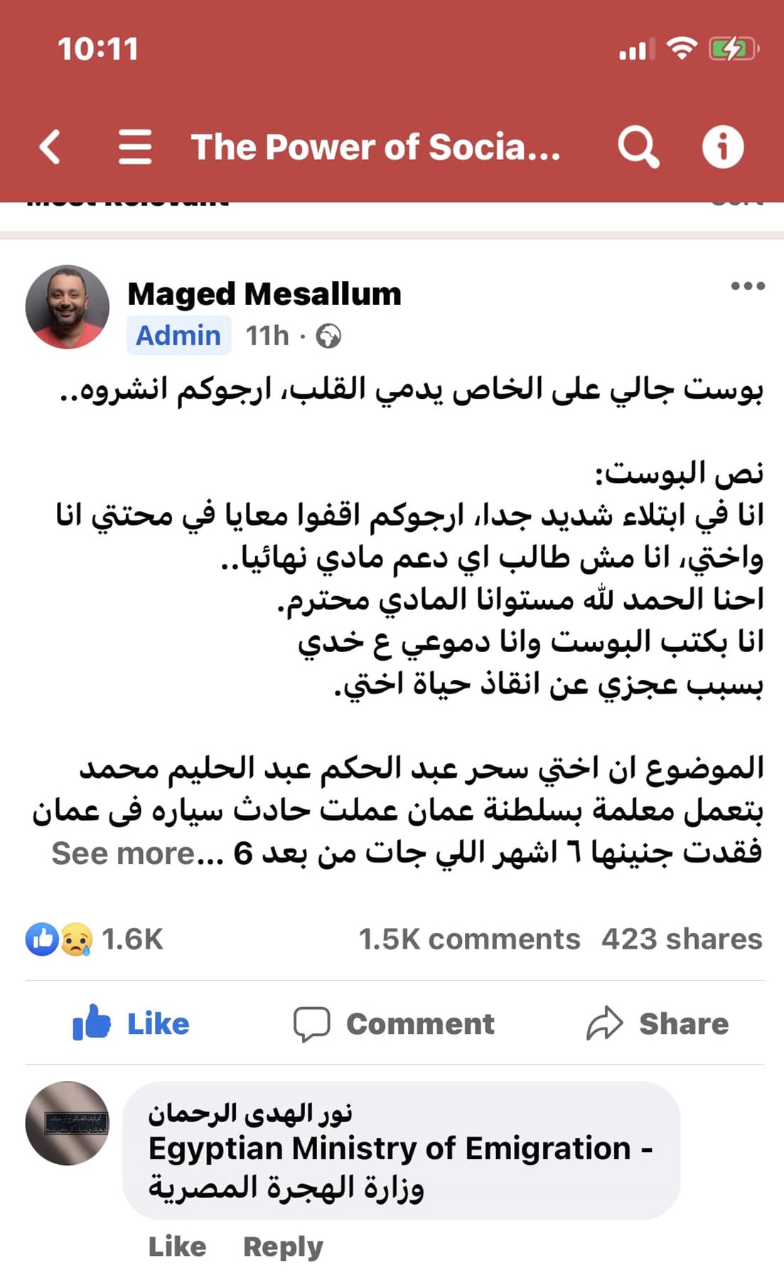 نشرت خلال الساعات القليلة الماضية، استغاثة من حجاجي عبد الحكم عبد الحليم محمد، شاب مصري بشأن شقيقته المقيمة بسلطنة عمان، وتعرضت لحادث سيارة أفقدها جنينها ذات الستة أشهر بعد أن رُزقت به بعد 6 سنوات من الزواج، قائلًا: أختي متواجدة بمستشفى الرستاق في محافظة جنوب الباطن من يوم الخميس قبل الماضي، وحالتها حرجة جدا، تحت الأجهزة الطبية وفي غيبوبة كاملة منذ عشر أيام.