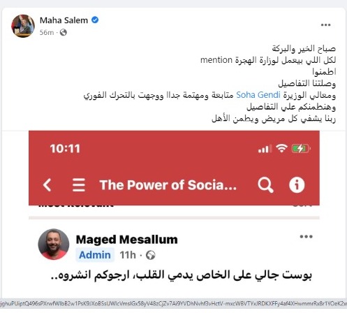 وفي هذا الصدد، نشرت مها سالم، المستشار الإعلامي لوزارة الدولة للهجرة وشئون المصريين بالخارج، أن تلك الاستغاثة وصلت بالفعل إلى وزيرة الهجرة السفيرة سها جندي، وأمرت بالتحرك الفوري والمساعدة العاجلة، موضحة: اطمأنوا وصلتنا التفاصيل والوزيرة سها جندي متابعة ومهتمة جدا ووجهت بالتحرك الفوري، وتابعت: هنطمنكم على التفاصيل، وربنا يشفي كل مريض ويطمن الأهل.