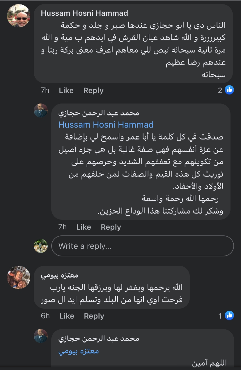 وكتب أحد مستخدمي مواقع التواصل الاجتماعي، تعليقًا على خبر وفاة السيدة بطلة صورة الأمومة، عبر تطبيق فيسبوك، حيث قال الناس دي عندها صبر وجَلَد وحكمة كبيرة.. والله شاهد عيان لا قرش في ايدهم بـ 100 والله مرة تانية، سبحانه.. تبص للي معاهم أعرف معنى بركة ربنا وعندهم رضا عظيم، سبحانه، ليرد عليه آخر، صدقت في كل كلمة بالإضافة إلى عزة انفسهم فهي صفة غالبة بل هي جزء أصيل من تكوينهم مع تعففهم الشديد وحرصهم على توريث كل هذه القيم والصفات لمن خلفهم من الأولاد والأحفاد.. رحمها الله رحمة واسعة.