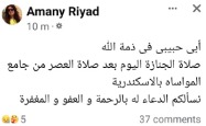 وكتب أحد المقربين من الإعلامية منشورًا عبر حسابه الشخصي بموقع التواصل الاجتماعي فيس بوك قال فيه: أبي وحبيبي في ذمة الله، صلاة الجنازة اليوم بعد صلاة العصر من جامع المواساة بالإسكندرية.. نسألكم الدعاء له بالرحمة والمغفرة والعفو والمغفرة.