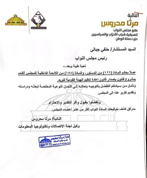 تقدمت عضو مجلس نواب، بمشروع قانون، بإصدار قانون إعادة تنظيم الهيئة القومية للبريد، حيث تعد هيئة البريد المصري أقدم وأهم مؤسسة وطنية في تقديم الخدمات المالية والبريدية بمصر.