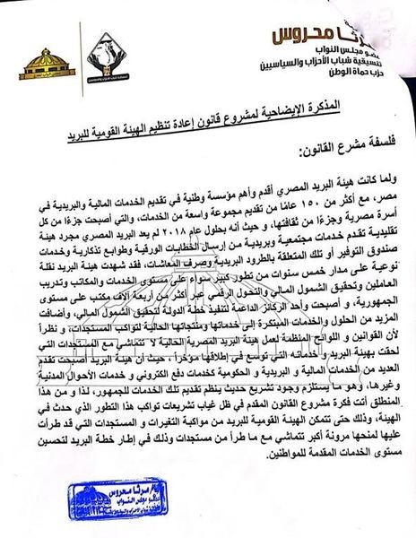 وقالت النائبة في المذكرة الإيضاحية لمشروع الذي حددت فلسفة مشرع القانون: لما كانت هيئة البريد المصري أقدم وأهم مؤسسة وطنية في تقديم الخدمات المالية والبريدية في مصر، مع أكثر من 150 عامًا من تقديم مجموعة واسعة من الخدمات، والتي أصبحت جزء من كل أسرة مصرية وجزء من ثقافتها، وبحلول عام 2018 لم يعد البريد المصري مجرد هيئة تقليدية تقدم خدمات مجتمعية وبريدية من إرسال الخطابات الورقية وطوابع تذكارية وخدمات صندوق التوفير أو تلك المتعلقة بالطرود البريدية وصرف المعاشات.