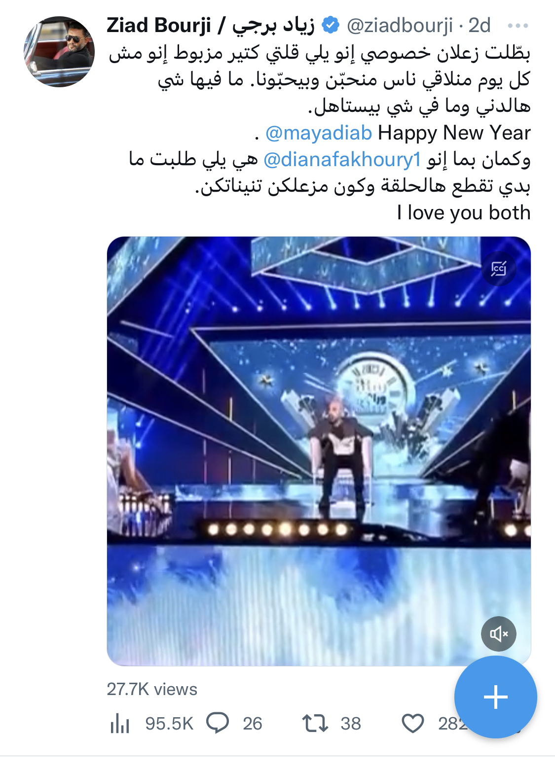 وفي نفس السياق، حاول الملحن زياد برجي العام الجديد إنهاء جميع الخلافات مع المطربة مايا دياب، حيث كتب لها عبر حسابه الشخصي على موقع التغريدات تويتر: بطّلت زعلان خصوصي إنو يلي قلتي كتير مزبوط إنو مش كل يوم منلاقي ناس منحبّن وبيحبّونا. ما فيها شي هالدني وما في شي بيستاهل. وكمان بما انو هي يلي طلبت ما بدي تقطع هالحلقة وكون مزعلكن تنيناتكن.