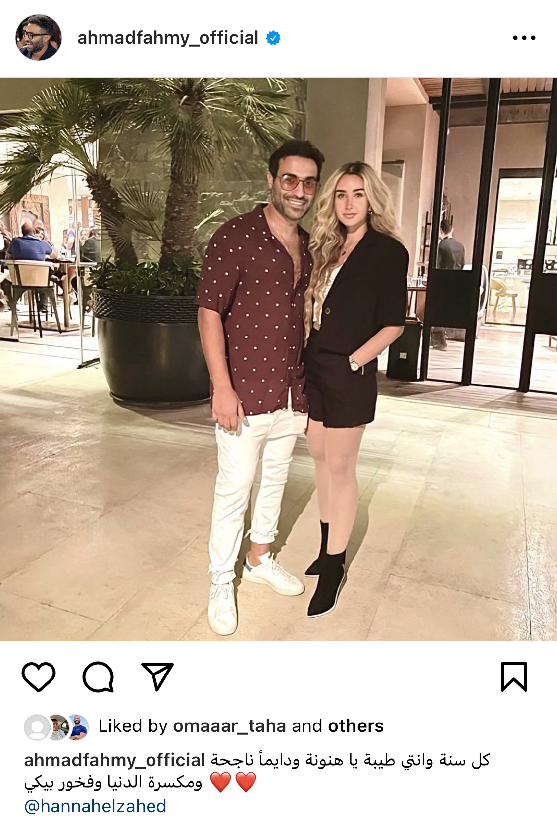 ونشر أحمد فهمي، صورة تجمعه بـ هنا الزاهد عبر حسابه الشخصي بموقع تبادل الصور والفيديوهات انستجرام، وعلق عليها: كل سنة وأنتي طيبة يا هنونة ودايمًا ناجحة ومكسرة الدنيا وفخور بيكي.