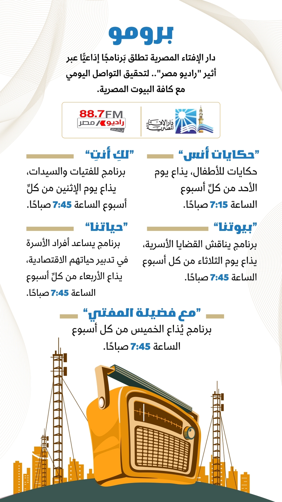 أطلقت دار الإفتاء المصرية، برنامجًا إذاعيًّا عبر أثير إذاعة راديو مصر؛ لتحقيق التواصل اليومي مع كافة البيوت المصرية، وذلك في إطار القيام بدَورها المهمِّ في المجتمع المصري، واستراتيجيتها الرامية إلى تحقيق الاستقرار الأسري والمجتمعي.