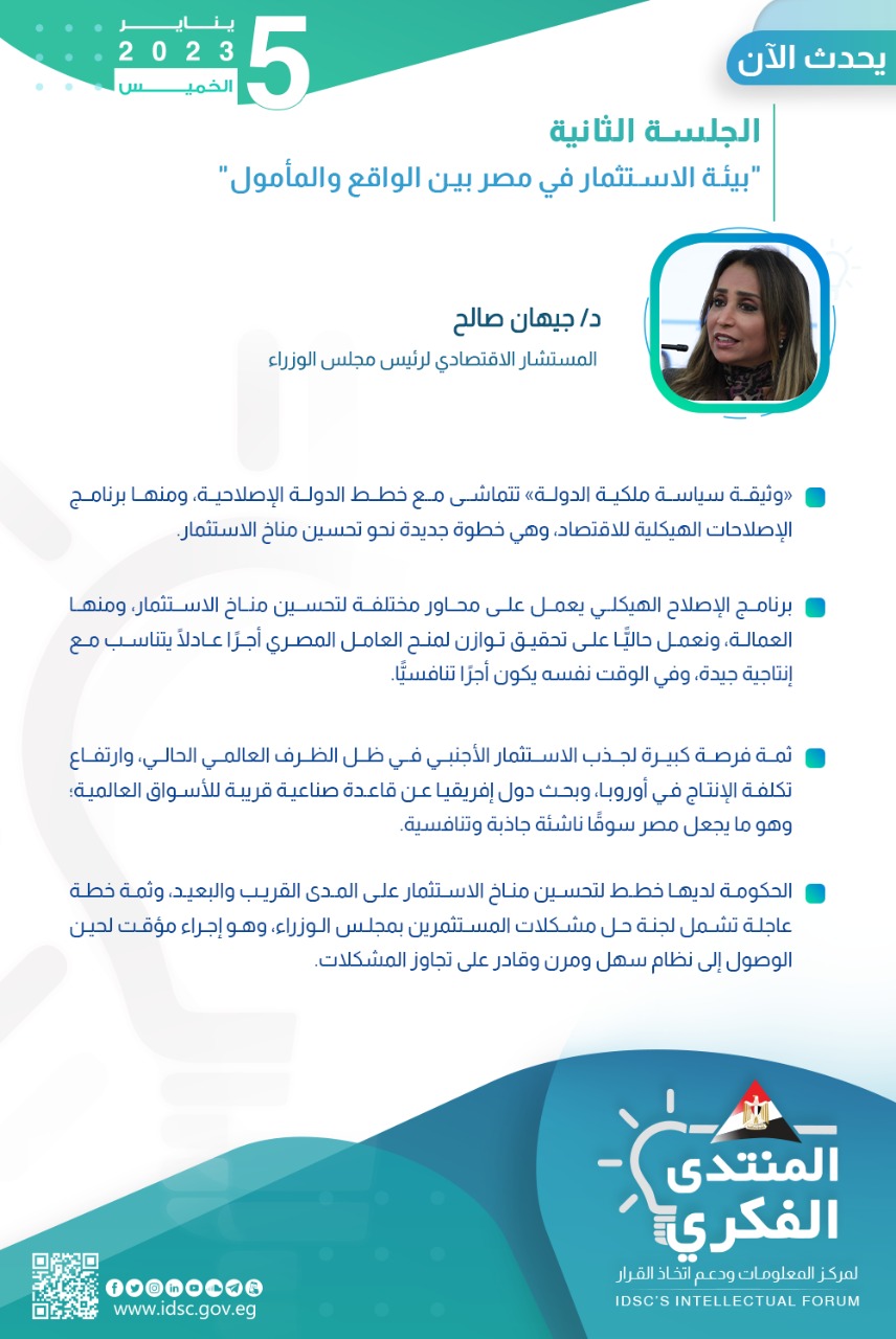 جاء ذلك خلال فعاليات الجلسة الثانية من المنتدى الفكري لـ مركز المعلومات ودعم اتخاذ القرار التابع لمجلس الوزراء، والتي تناقش موضوع بيئة الاستثمار في مصر بين الواقع والمأمول.