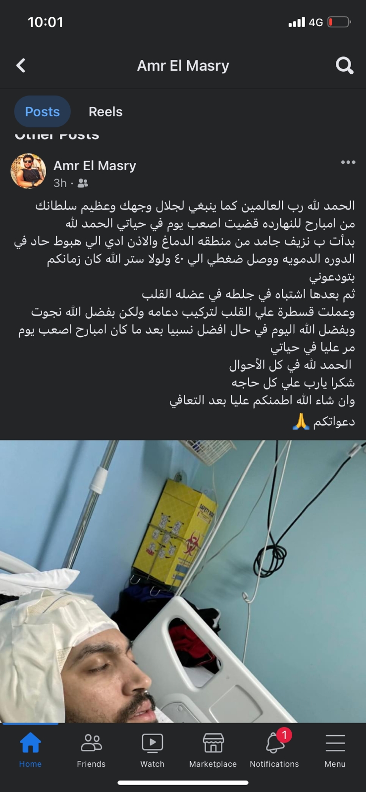 وكتب عمرو المصري عبر حسابه الخاص بموقع التواصل الاجتماعي فيس بوك: الحمد لله رب العالمين كما ينبغي لجلال وجهك وعظيم سلطانك، من إمبارح للنهاردة قضيت أصعب يوم في حياتي الحمد لله، بدأت بنزيف جامد من منطقة الدماغ والأذن أدى إلى هبوط حاد في الدورة الدموية ووصل ضغطي إلى 40 ولولا ستر الله كان زمانكم بتودعوني.