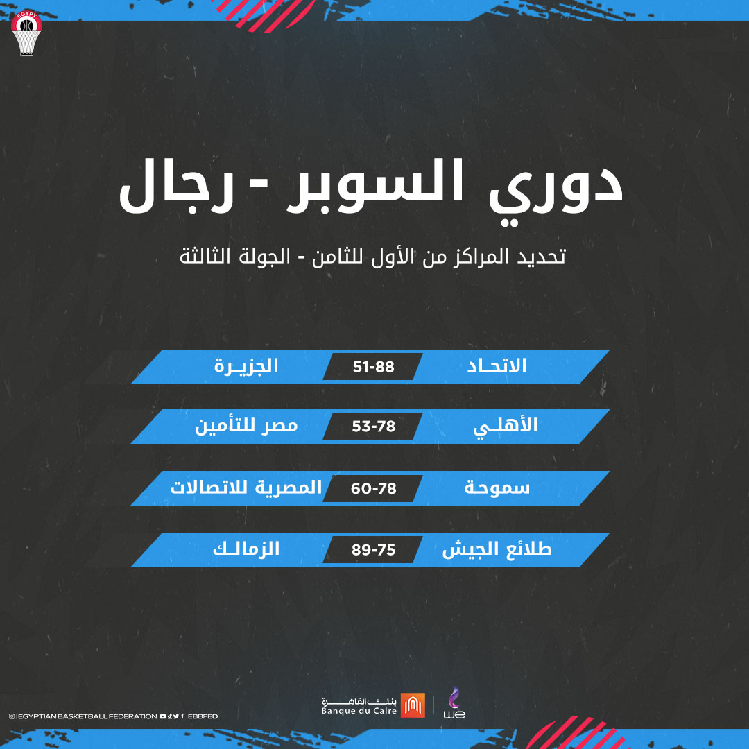 واصل فريق الاتحاد السكندري صدارة جدول ترتيب المجموعة بدوري السوبر لكرة السلة عقب ختام منافسات الجولة الثالثة، بينما تذيل فريق المصرية للاتصالات المنافسات، ضمن لقاءات تحديد المراكز من الأول إلى الثامن بدوري السوبر لكرة السلة رجال.