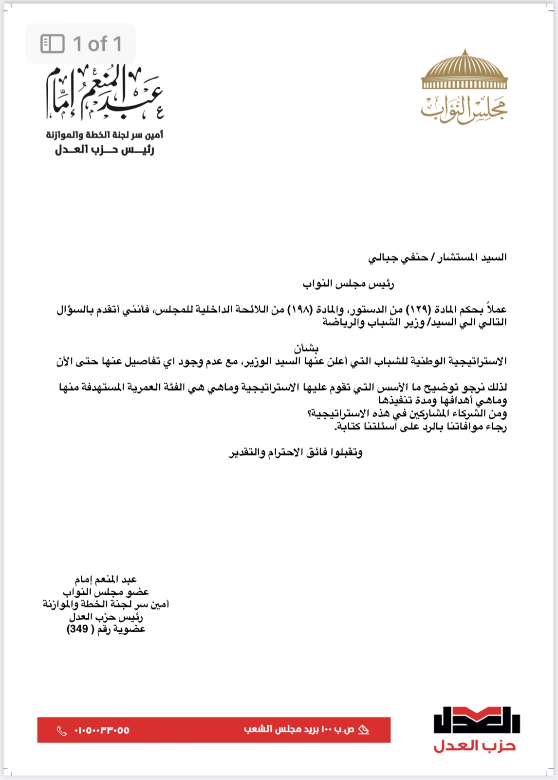 تقدم رئيس حزب العدل النائب عبد المنعم إمام، بسؤال برلماني لوزير الشباب والرياضة الاستراتيجية الوطنية للشباب، التي أعلن عنها الوزير، مع عدم وجود أي تفاصيل عنها حتى الآن.