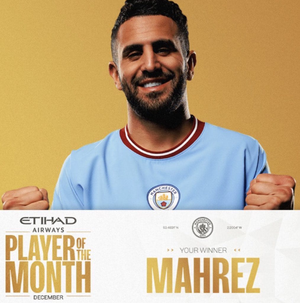 ونشر نادي مانشستر سيتي عبر حسابه الرسمي على إحدى مواقع التواصل الاجتماعي تويتر، إعلان فوز رياض محرز بجائزة أفضل لاعب في شهر ديسمبر مع الفريق، وعلق قائلًا: لاعب الاتحاد لهذا الشهر هو ساحر العرب رياض محرز.