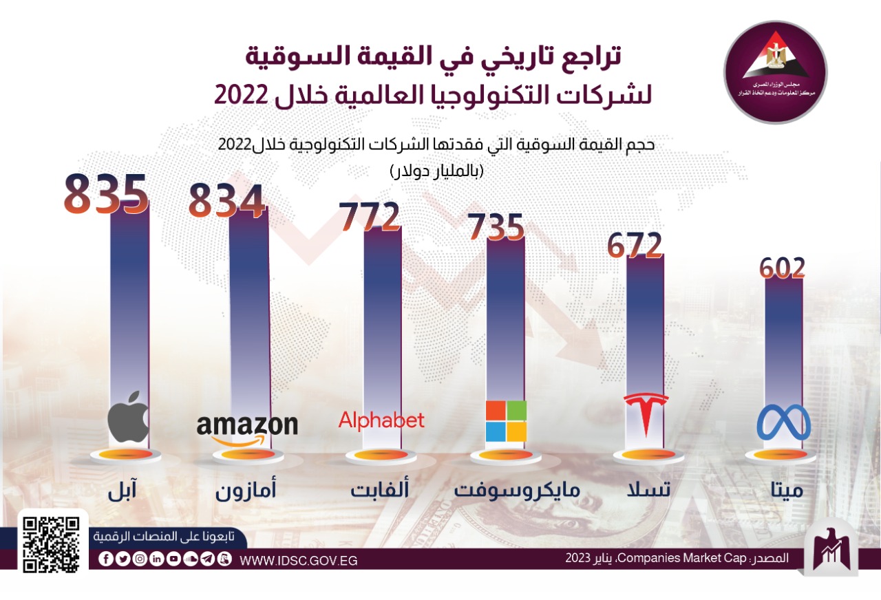 وأضاف مركز المعلومات: فقدت شركة ميتا المالكة لتطبيق فيس بوك خلال عام 2022 نحو 65.3% من قيمتها السوقية، وفقدت شركة آبل ما يقرب من القيمة السوقية لها، إضافة إلى أمازون والتي فقدت أكثر من 49% من قيمتها السوقية خلال 2022.