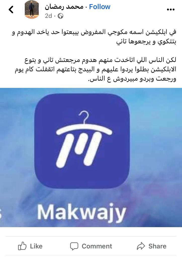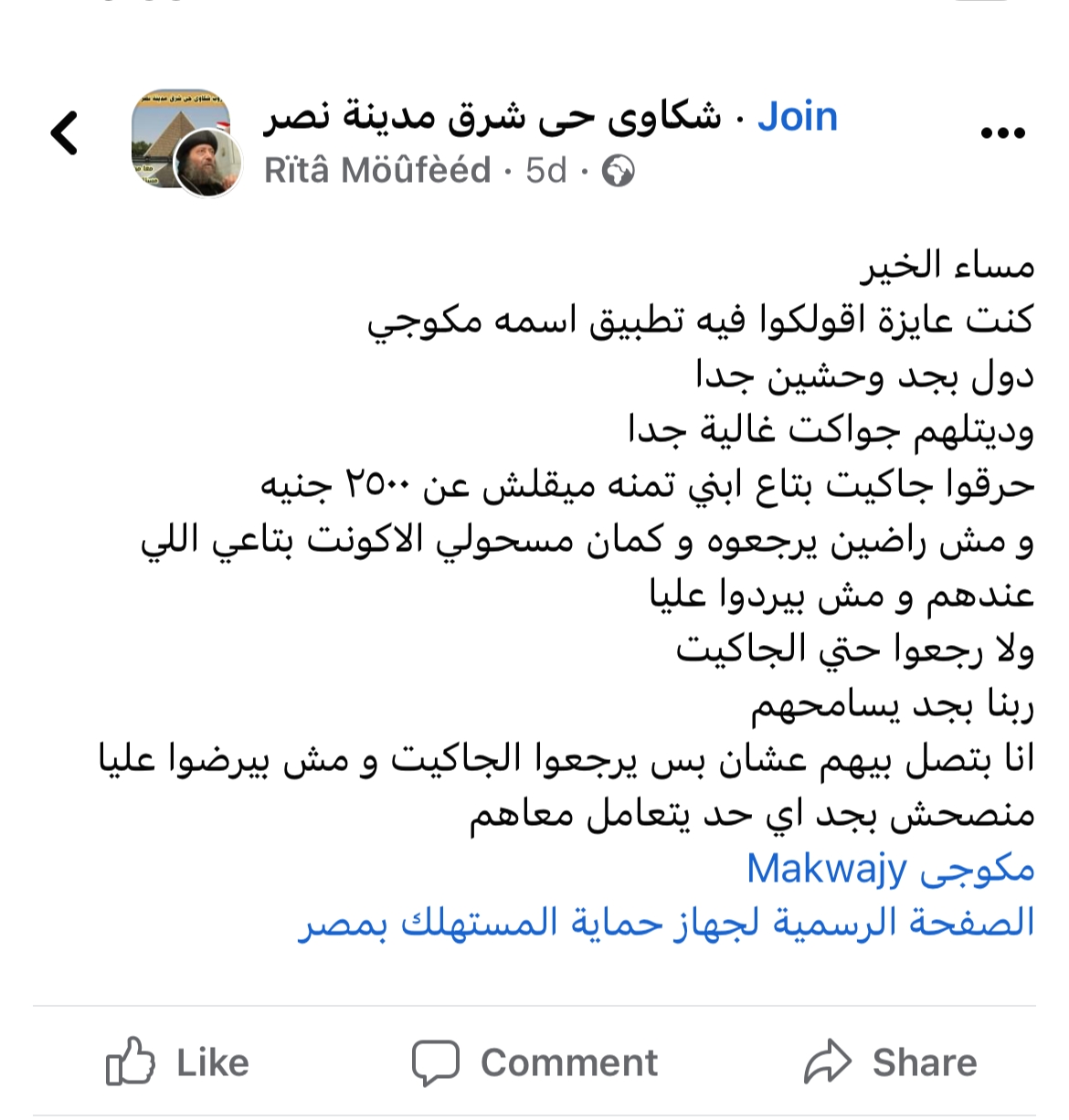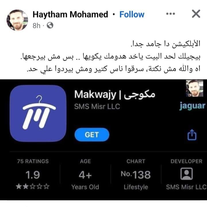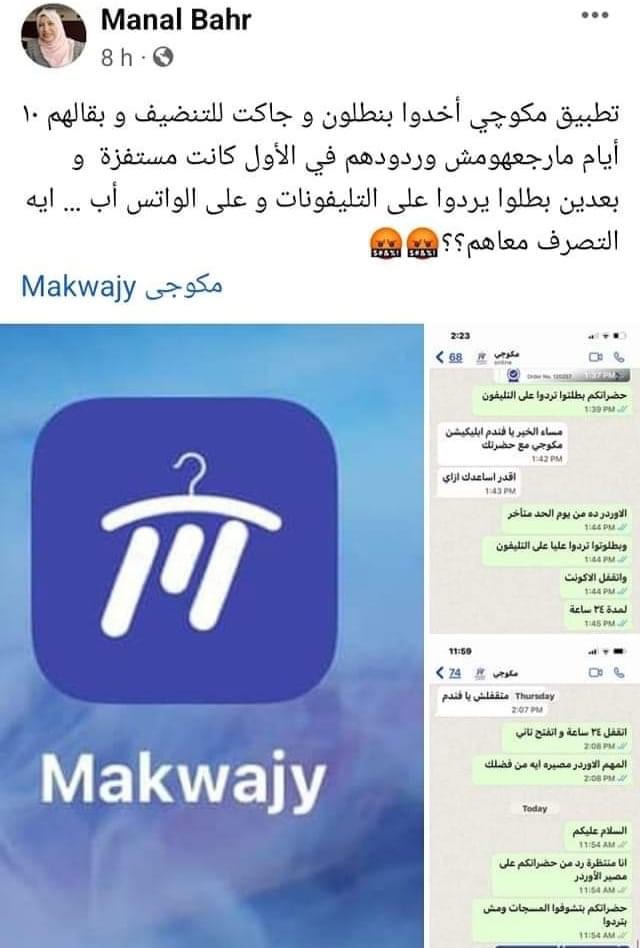 حيث نشرت منذ عدة أيام إحدى مستخدمات مواقع التواصل الاجتماعي على أحدى الجروبات شكوتها محذرة من استخدام التطبيف، قائلة: مساء الخير كنت عايزة اقولكوا فيه تطبيق اسمه مكوجي، دول بجد وحشين جدا، وديتلهم جواكت غالية جدا، حرقوا الجاكيت بتاع ابني تمنه ميقلش عن 2500 جنيه، ومش راضيين يرجعوه، وكمان مسحولي الأكونت بتاعي اللي عندهم، ومش بيردوا عليا.