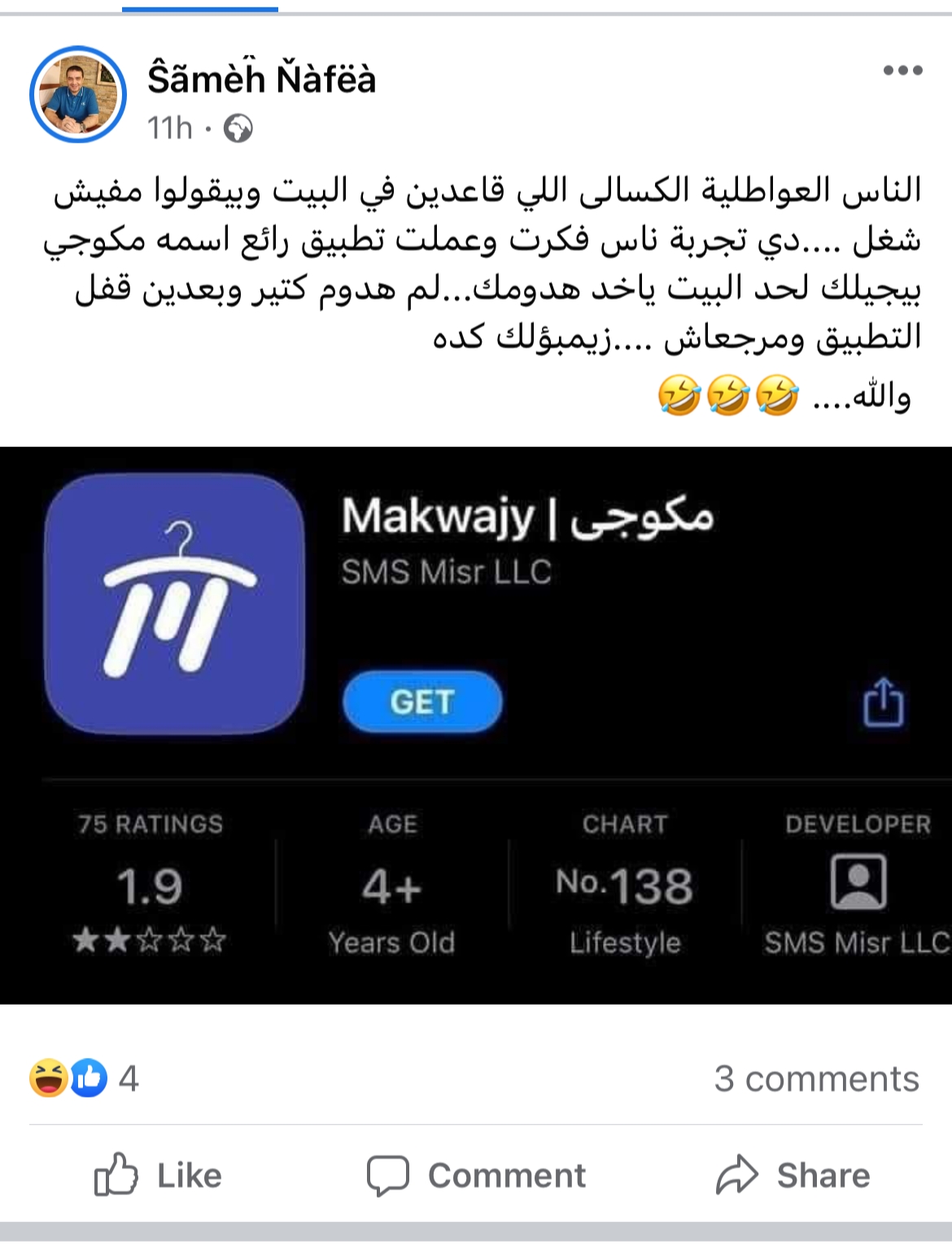 قال هيثم محمد أحد مستخدمي فيسبوك على صفحته: الأبلكيشن ده جامد جدا، بيجيلك لحد البيت وياخد الهدوم يكويها، بس مش بيرجعها، أه والله مش نكتة، سرقوا ناس كتير ومش بيردوا على حد.