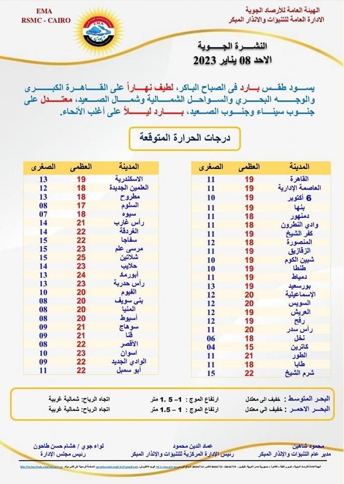 كشفت هيئة الأرصاد الجوية حالة الطقس اليوم الأحد 8 يناير 2023، حيث يكون الجو لطيف على شمال البلاد حتى شمال الصعيد، معتدل الحرارة على جنوب الصعيد وجنوب سيناء، بارد ليلًا على أغلب الأنحاء، كما أن هناك أمطار متفاوتة الشدة على بعض المناطق اليوم.