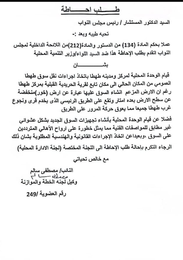 تقدم النائب مصطفى سالم، وكيل لجنة الخطة والموازنة، في مجلس النواب، بطلب إحاطة ضد اللواء هشام أمنة وزير التنمية المحلية، بسبب قيام الوحدة المحلية لمركز ومدينة طهطا في سوهاج باتخاذ إجراءات نقل سوق طهطا العمومي من المكان الحالي إلى مكان تابع لقرية الحريدية القبلية، بمركز طهطا.