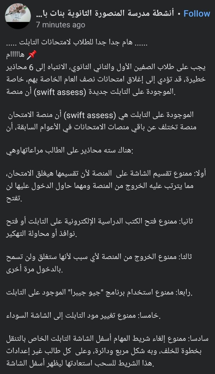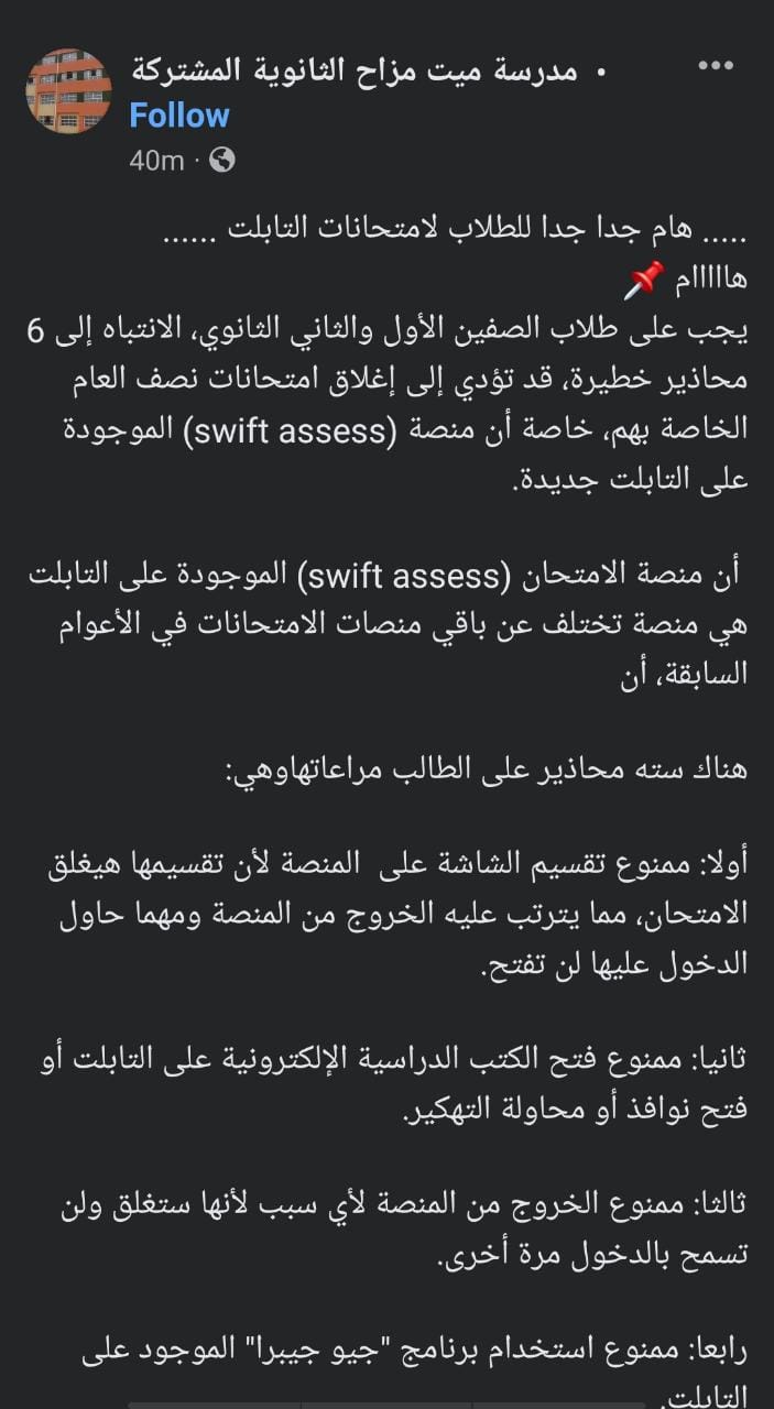 وقالت مدرسة العامرية الثانوية في هذا الإطار، مُخاطبةً طلاب الصفين الأول والثاني الثانوي، إنه يجب على طلاب الصفين الأول والثاني الثانوي؛ الانتباه إلى 6 محاذير خطيرة، قد تؤدي إلى إغلاق امتحانات نصف العام الخاصة بهم، خاصة أن منصة (swift assess) الموجودة على التابلت جديدة، مشيرة إلى أن منصة الامتحان (swift assess) الموجودة على التابلت، هي منصة تختلف عن باقي منصات الامتحانات في الأعوام السابقة.