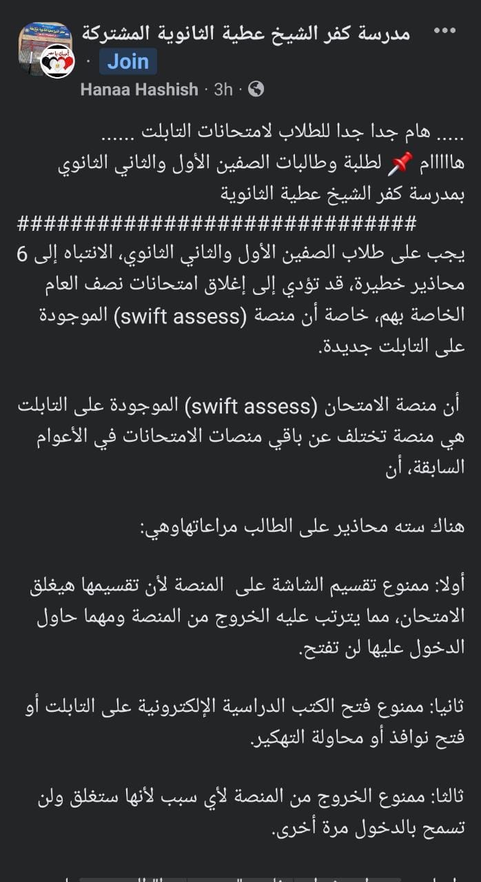 ووجهت مدرسة كفر الشيخ عطية تنبيها لطلاب الصفين الأول والثاني الثانوي، قائلة: يجب على الطلاب؛ الانتباه إلى 6 محاذير خطيرة، قد تؤدي إلى إغلاق امتحانات نصف العام الخاصة بهم، خاصة أن منصة سويفت أسيس الموجودة على التابلتت؛ جديدة.