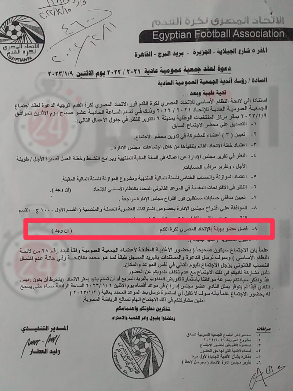 ونص البند التاسع في جدول أعمال اجتماع الجمعية العمومية على فصل عضو بهيئة بالاتحاد المصري لكرة القدم (إن وجد)، وتوجه القاهرة 24 بالسؤال إلى مصدر داخل اتحاد الكرة حول سبب وضع هذا البند في جدول أعمال اجتماع الجمعية العمومية للجبلاية، وما إذا كان سيتم استخدامه لتوقيع عقوبة على مرتضى منصور أو أي شخص آخر.