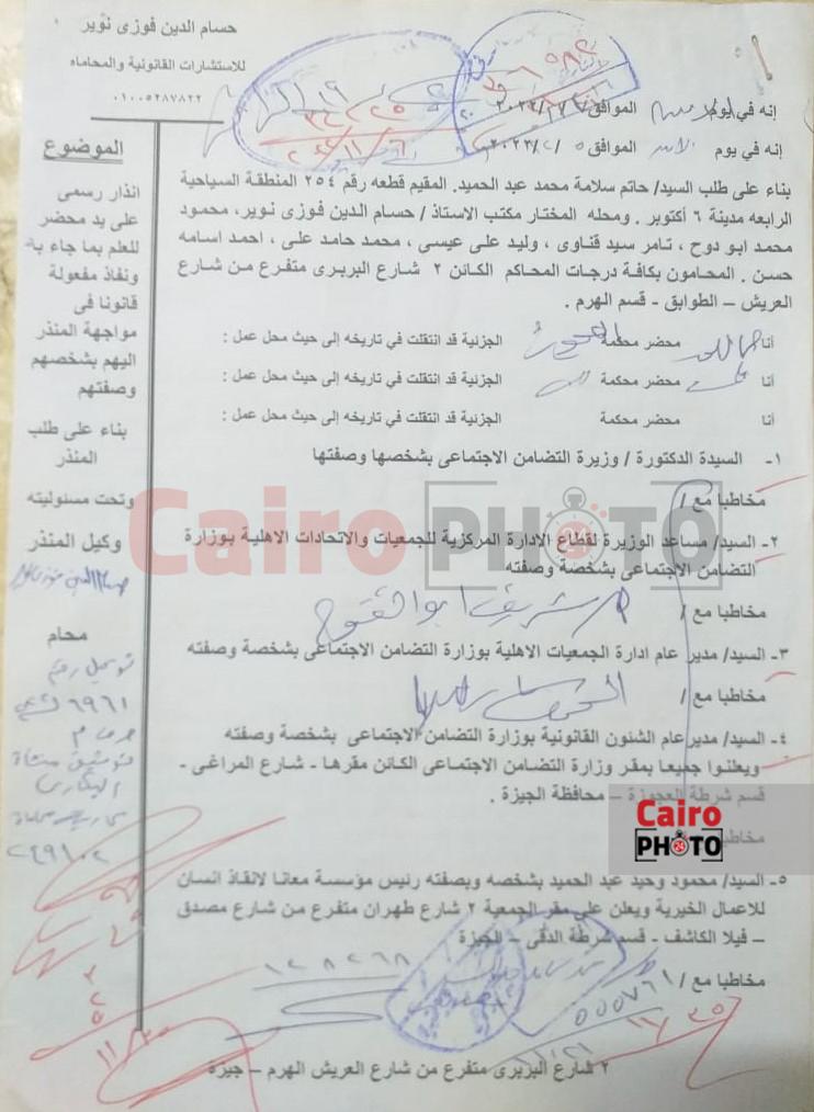 تزوير إيصالات التبرعات وتلاعب بالأوراق.. ننشر نص إنذار أمين صندوق معانا لإنقاذ إنسان السابق لوزيرة التضامن | خاص